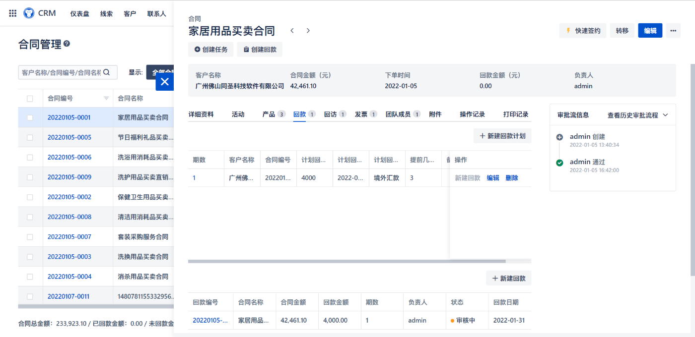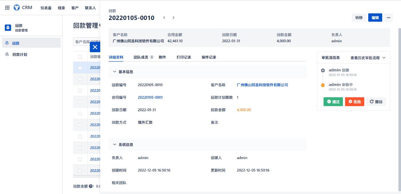 回款添加审批后,在回款详情中会显示回款的审批流程,以及审批的记录,回款审批流在后台进行配置。