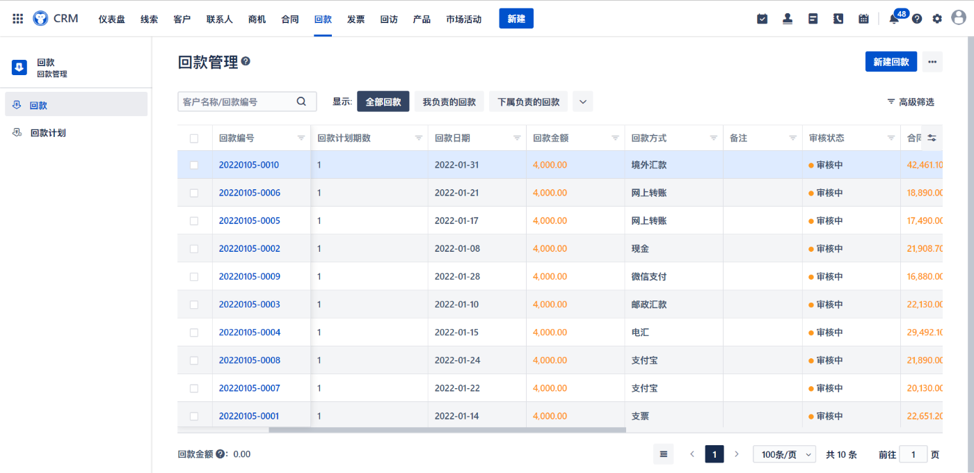 回款模块与合同、客户关联,方便销售更好回顾整体客户从跟进到成交的全过程,每个合同已经回款金额、未回款金额清晰展示。