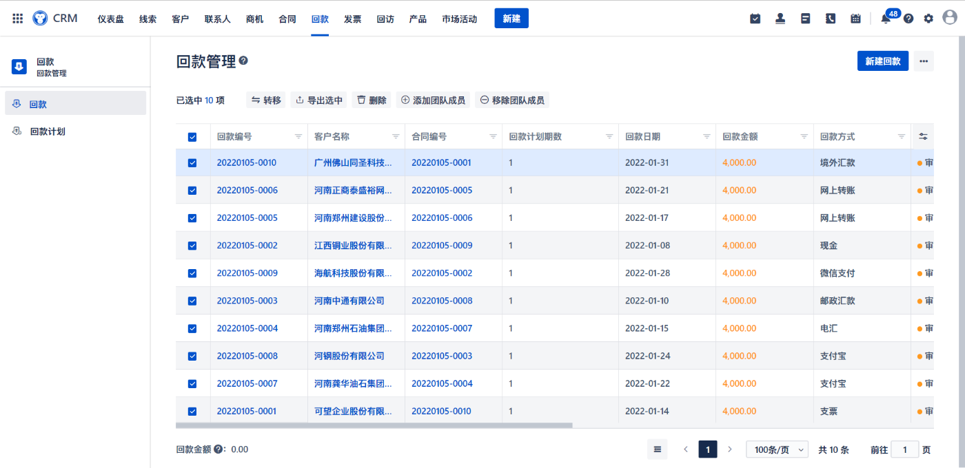 在回款列表中,将显示所有回款的字段信息及审核状态。用户可以在右侧点击配置按钮,自定义配置回款显示的字段及字段的顺序。 回款在支持基本的新建、编辑、删除操作外还支持回款负责人转移及导出操作。