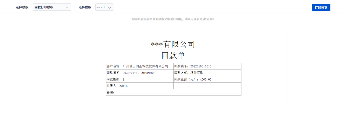 您可以像使用word一样,在系统中便捷设置回款单模板,一键打印。